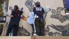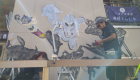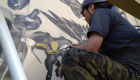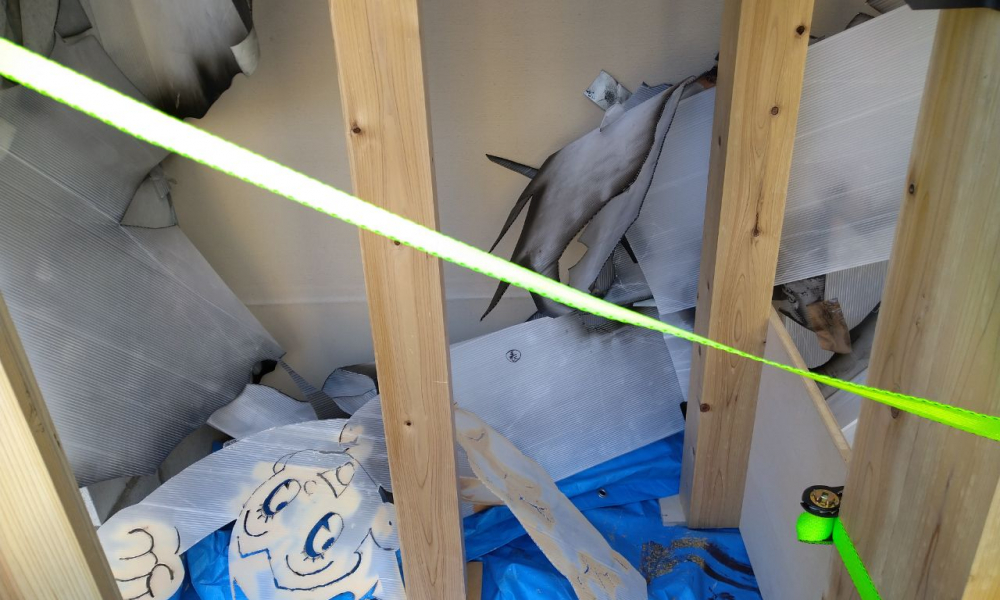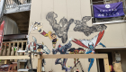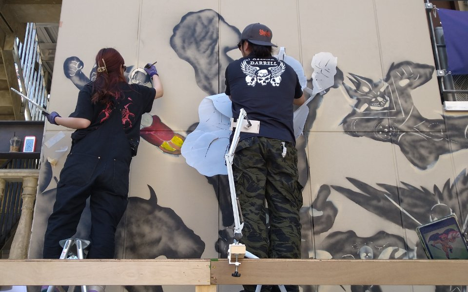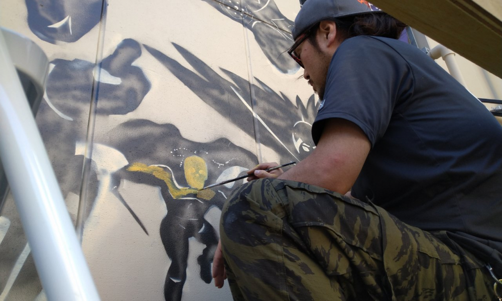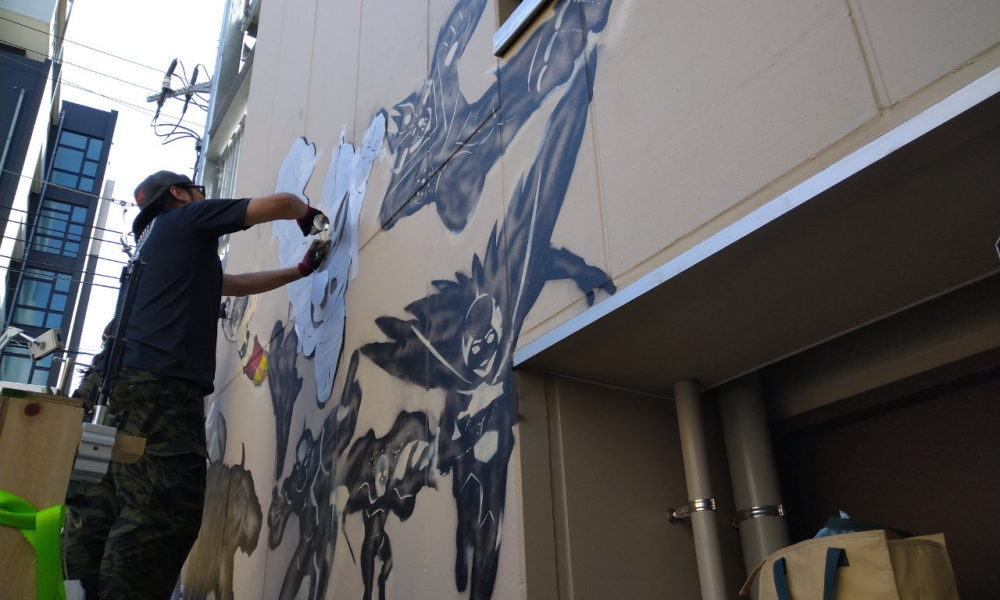 ライブペインティングを見に来てくれた人に楽しんでもらえるように、最初はシルエットから・・・ここからどんどん色づけされて正体が分かってくるそうですよ。にしてもこのシルエットがすごすぎる。