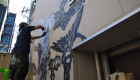 今日も登戸ゴールデン街ビルの壁面に壁画を描いています。