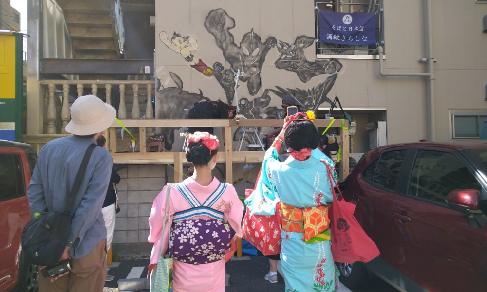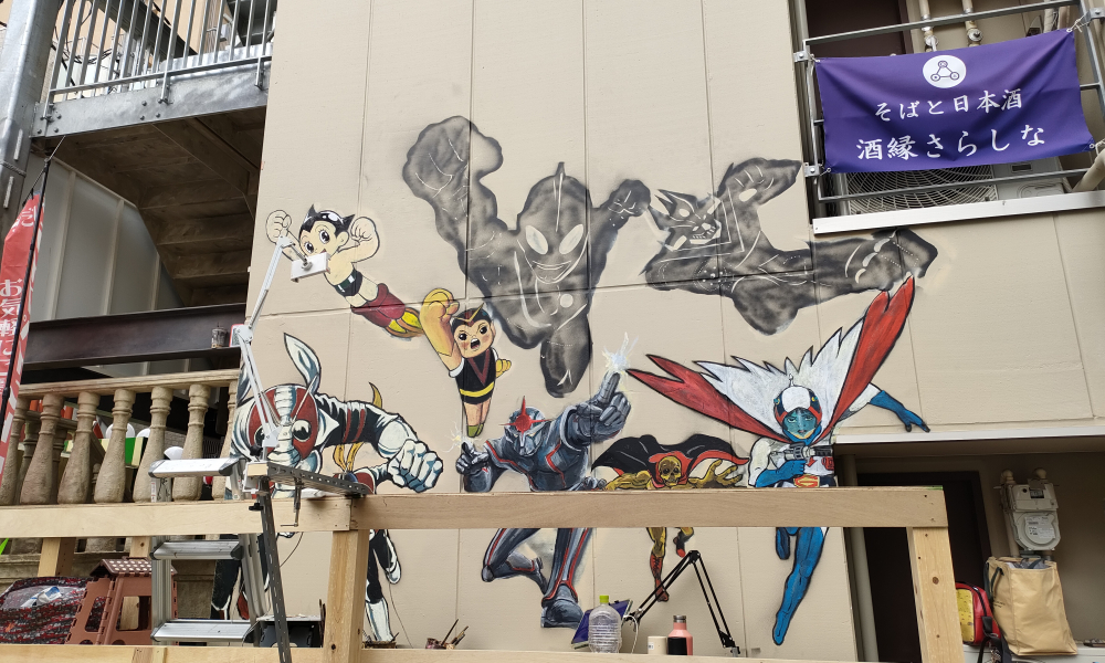 あれは何のキャラクターだろう?と思わず検索。あれはレインボーマンじゃない?!ほら、インドの山奥…♪の主題歌のやつ!!と、たまたまライブペインティングを見に来た方と楽しくおしゃべり。「今なら好きなキャラクター書きますよ」のアトリエダレル亀山裕昭さんの一言に、思わず、ちんどん屋さんからのリクエストも^^昔懐かしの主題歌の流れる中、普段見ることができない絵を描く筆遣いを間近で見られたり、登戸ゴールデン街を作ったお二人と直接お話できたりと、とってもの楽しい時間を過ごしてきました♪