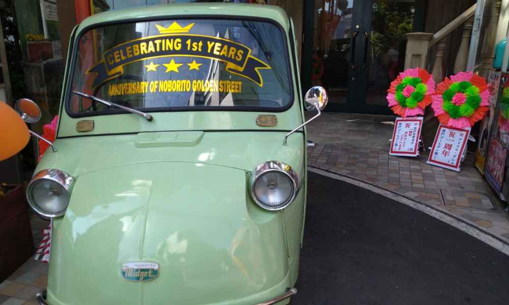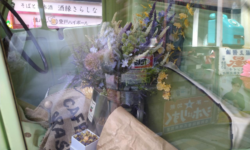 あら、ダイハツミゼット♪車に詳しくない私でもこの車の名前は知っています。映画などでも時々見かけますよね。でも、実際に見たのは初めて。こんなサイズ感なんですね。中をのぞくとかわいい花束が小箱の中には物語を想像させるような宝物が入っていましたよ。フロントガラスは1周年のアニバーサリー仕様に。そしてそしてビルから出る際には帰りがたくなるような一言が。どうしましょう、こんなこと言われたら帰れなくなっちゃいますね^^