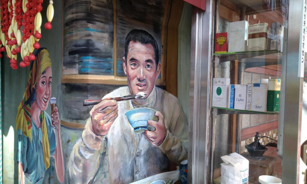 タバコ屋の中で白米を食べたり、ビールを飲んだり。。。なんとも人選がエモい。どこから発想が出てくるのでしょう?そして絵のクオリティーの高さはさすが画家として数々の作品を作り上げている亀山裕昭さんと長内絵海さんならでは。