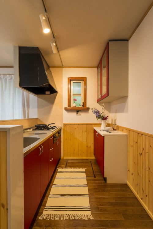 キッチンは3口コンロ。赤い扉がアクセントとなっています!